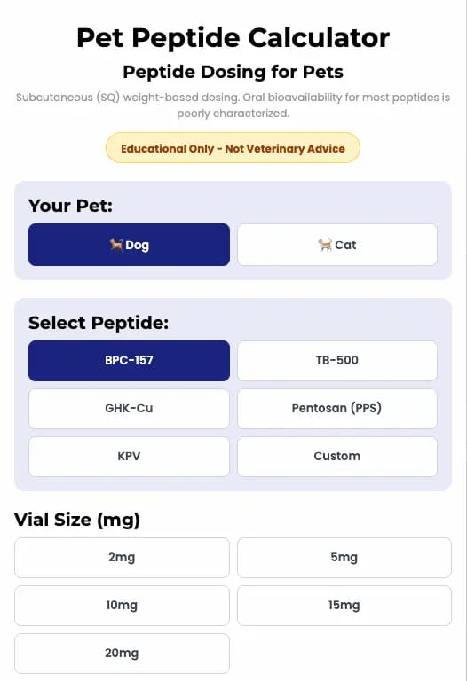 The tool at Project Biohacking approaches this honestly. It applies weight-scaled reconstitution logic calibrated for species-appropriate mass inputs. It is a reference tool, not a clinical instrument. It does not account for species-specific pharmacokinetics, individual animal health status, or veterinary contraindications, and it says so.