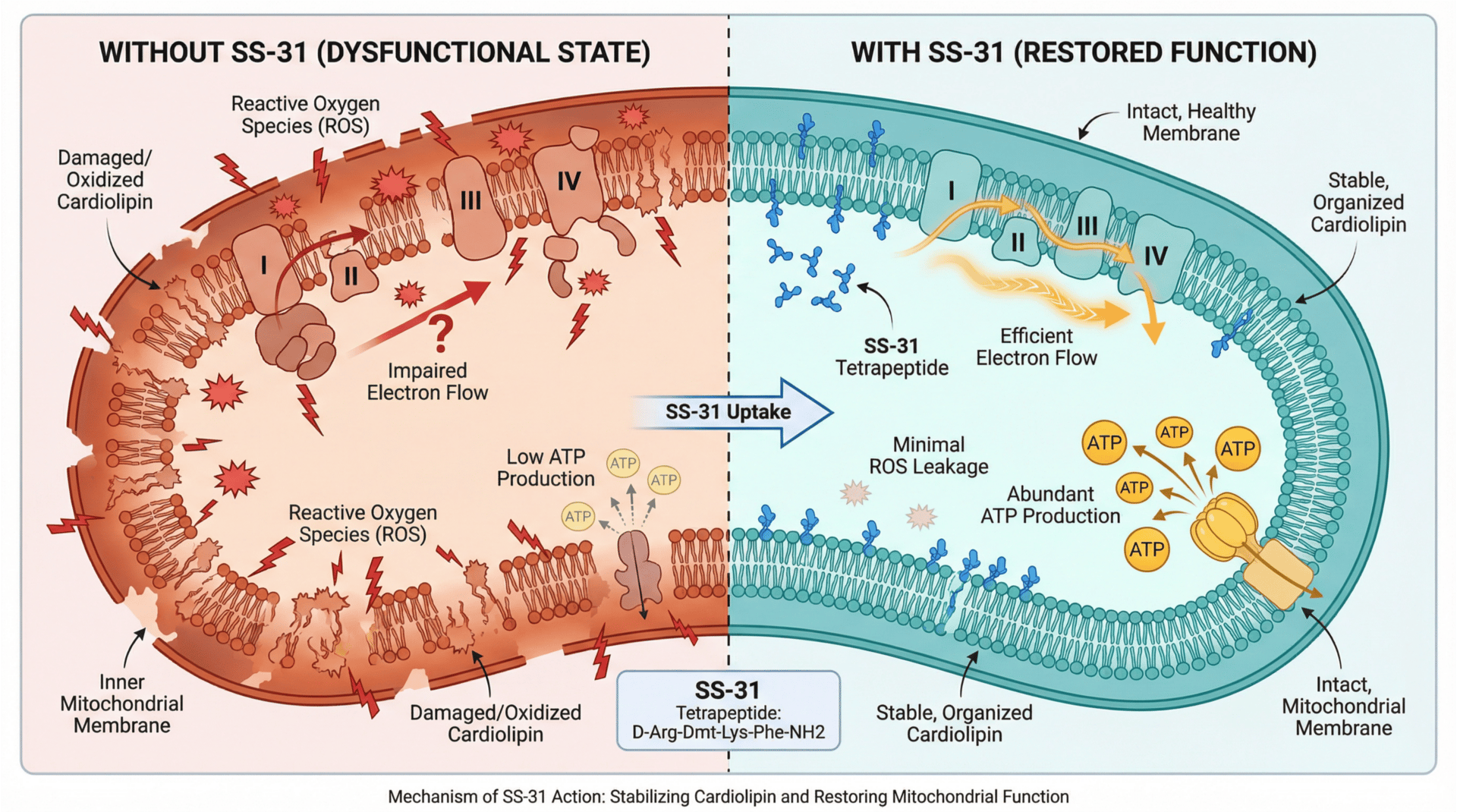 SS-31 is a mitochondria-targeted tetrapeptide. It crosses cell membranes, enters mitochondria, and binds directly to cardiolipin—a phospholipid embedded in the inner mitochondrial membrane.